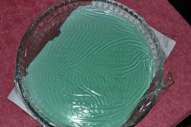 Tomar el plato plano grande optó por preparar y presentar el paraíso piña y llene el fondo de ella con unos milímetros de su bebida azul. Cubrir con plástico transparente (para evitar mojar la arena).