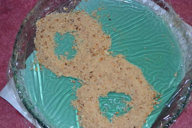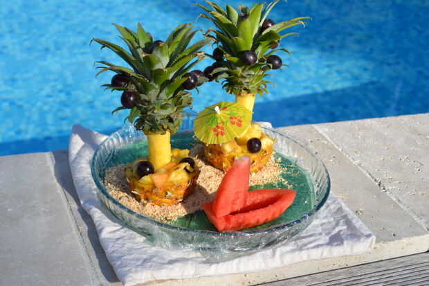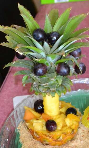 A continuación llene la piña "palmeras" con la ensalada de frutas y coloque algunas uvas negras en la parte arbolada de ella (puede utilizar cadena si es necesario). Colóquelos sobre la arena en el plato.