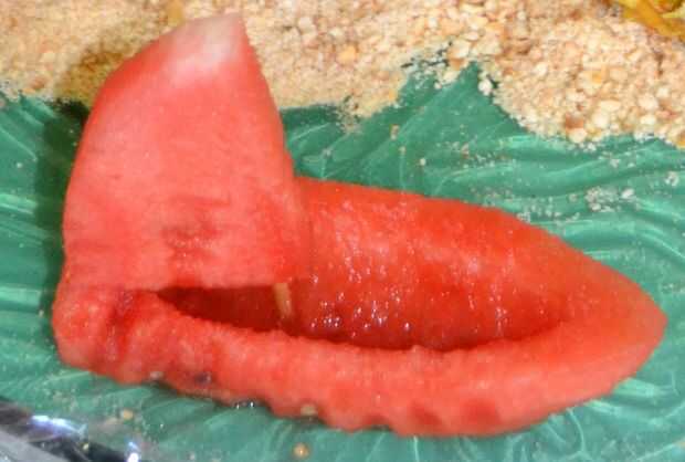Finalmente establecidas todas tus decoraciones extras de sandía y cualquier otro material (parasol de papel o peces...) en el plato y está listo para servir y comer!
