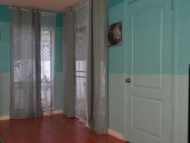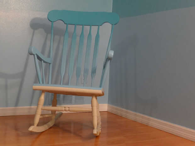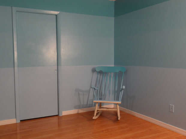 Para finalizar la transformación, el mobiliario adecuado es importante. Blanco mesas y estantes, decidimos, coincidiría bien sin llamar la atención lejos del patrón de la pared. También decidimos incluir una estilo Key West mecedora pintada con el mismo concepto en mente.