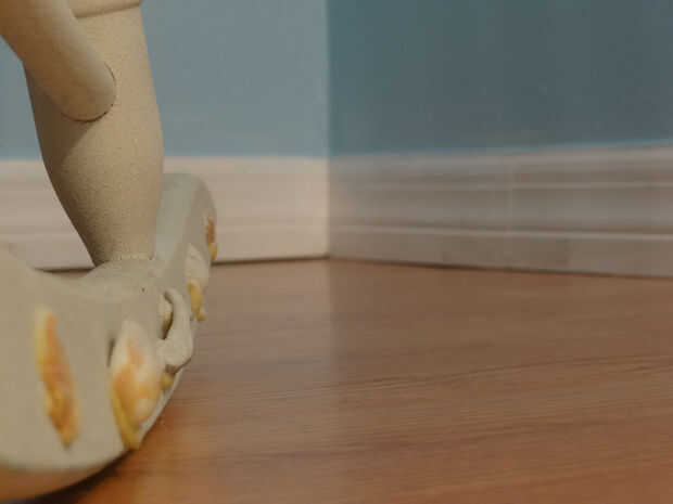 Para hacer la silla había pintada la parte inferior con una pintura sintética arena y aplicado las conchas con pegamento. La parte de atrás de la silla encontramos los colores de la pared en pintura de aerosol, lo pintó de un color y luego rocía la parte superior ligeramente crea un gradiente suave que coincide con la pared detrás. Para terminar el efecto del borde del asiento se pintó de blanco al igual que la espuma de una ola rodando sobre una playa.
