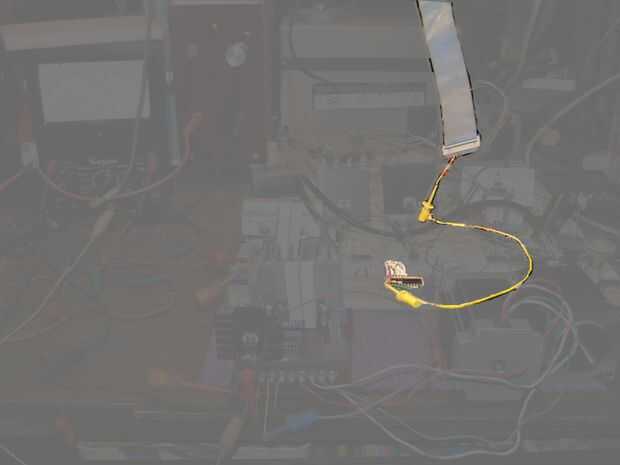 En la imagen he difuminado el fondo para resaltar el 25 cinta cable que sale del conector sub D conectado a un cable de puerto paralelo. Se conecta a mi circuito prototipo de este proyecto en un protoboard. Eso es todo, un IC con unas resistencias. Este proyecto simplemente duplica una y otra vez ese segmento de circuito simple.