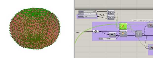 La forma del componente superficial se dividen en obras de saltamontes es hacer referencia a las superficies, no polisuperficies (breps) las 8 esferas originales a necesitar hacer referencia para crear las calabazas puntos de la superficie. El problema es que esto crea puntos dentro de la calabaza que esencialmente así estos puntos necesitan ser removidas, por lo que la secuencia de comandos en los pasos siguientes sólo se hace referencia a los puntos en la superficie de la calabaza.