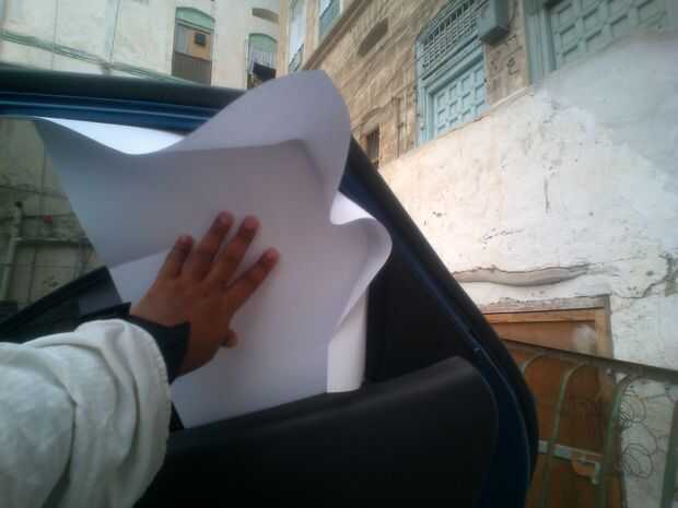 tomar un papeles A3 y empujarlos hacia las ventanas de coche que tienen la forma de ellos