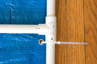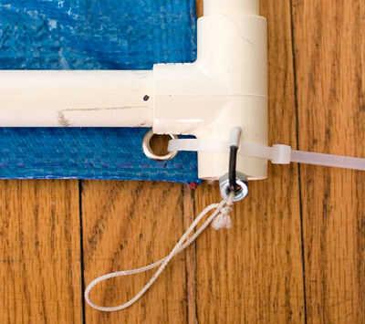 Zip atar la lona a la estructura utilizando los ojales, los lazos de esquina deben ser capaces de deslizarse sobre los conectores T y se sujeta por los ganchos de las cuerdas del amortiguador auxiliar.