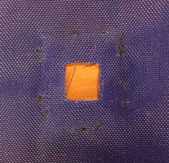 2. Por un lado, corte un agujero cuadrado en la tela que es aproximadamente 2/5" por 2/5".