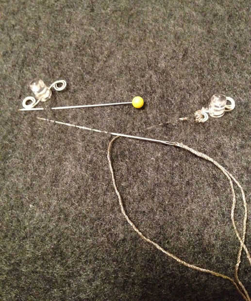 Coloque los LEDs en el que desea los ojos para ir con los cables positivos y negativos, dispuestos como en el esquema del circuito (negativo a la izquierda, positiva a la derecha, en las fotos).  Nudo el hilo conductor y coser un montón de lazos a través de la tela y sobre izquierdo, negativo, pueda la derecha LED, obtener una buena conexión.  Luego realizar algunos puntos de sutura a través de la tela base sobre a plomo izquierdo izquierdo LED, como se muestra en la foto primera.  Coser bucles sobre el plomo negativo de LED izquierdo para sujetar a la tela y conectarlo al otro LED.  Retire la aguja pero no corte el hilo; usted tendrá que coser más con él en un minuto.  Ver la segunda foto.