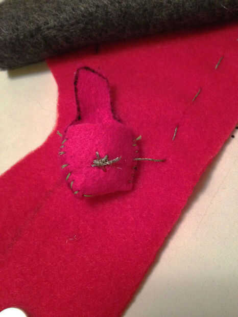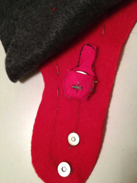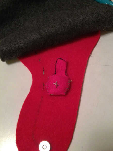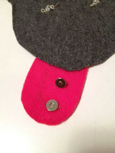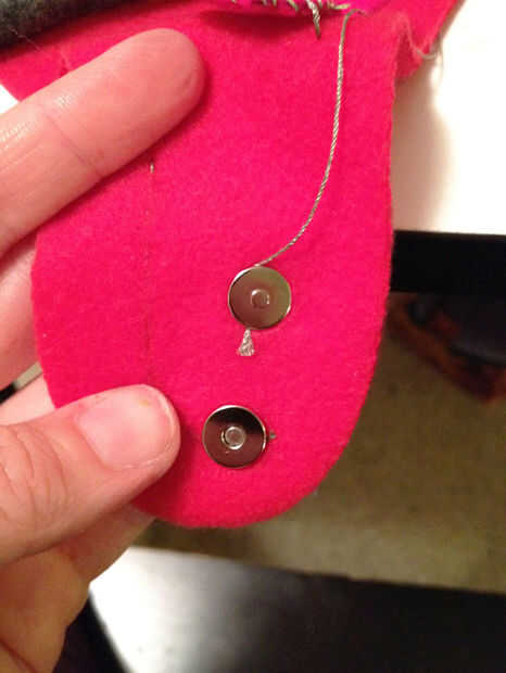 De manera similar a cómo el primer broche de imán se colocó la mitad, poner en otro medio (asegurándose de que es una coordinación medio no una coincidencia) donde se asienta la primera mitad cuando la lengua se dobla hacia abajo. Envuelva el extremo de la aguja no de hilo conductor alrededor de él durante la instalación. Vea las fotos para esto, es más claro. Ahora coser el rastro de la parte del broche de presión en la parte inferior de la batería y punto firmemente a la terminal negativa.