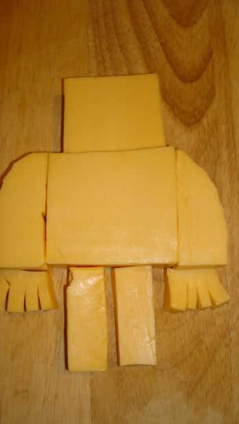 Tallar las líneas rectas con el extremo redondeado de la brocheta, así como los puntos pequeños de muescas para el cuerpo.   Cuchillo de uso para cortar las manos.  Se pegan los rábanos con selecciones del diente antes de colocarlos en el robot.  Recortar selección de diente y orejas y pies donde van.  Use círculos de rábano para el ojo interno.