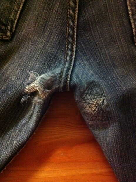 Este par específico de jeans tengo tiende a usar delgadas no muy lejos de la costura de la entrepierna, hacia la parte posterior. En este caso, realmente no puedo convertirlos en pantalones cortos y realmente me gustaría no tener que tirar hacia fuera. Tengo puedo pagar buen dinero por ellos... o metido en una tienda de descuento o ahorro. A pesar de todo, me gusta aunque tengo problemas para tomar fotografías de ellos.