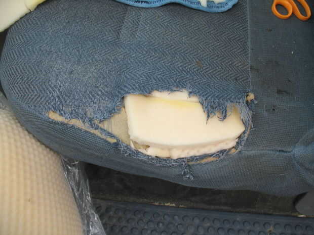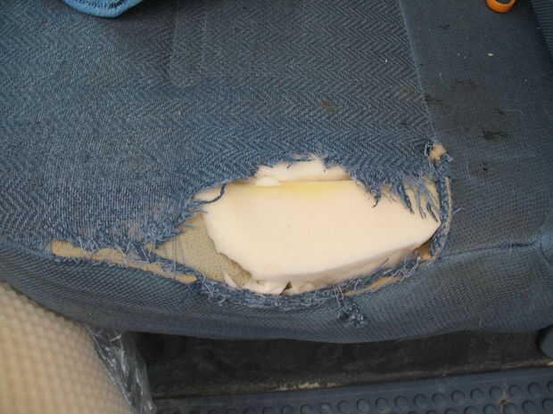 Cortar pequeños trozos y rellenar el orificio. Quieres tenerlo embalado firmemente en la parte inferior del agujero, pero no desea bombear hacia fuera en la parte superior. Más sobresale en la parte superior, el más apretada que tendrás que coser el parche. Usted también quiere estar seguro de que allí no están los bordes bruscos en su espuma; Había afilado borde de la capa superior con las tijeras por lo que es una transición suave de la espuma original a la espuma adicional.