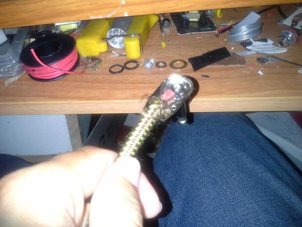 el alambre de la soldadura con el soldador. el alambre expuesto va soldado a la carcasa del jack y el cable que está siendo aislado se soldó a la ficha de punta que en este caso su en el centro. notado lo rojo es del encogimiento del calor, utiliza para evitar que el cable de tierra al tocar el cable de la punta.