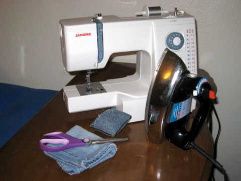 Se necesita una máquina de coser, hilo de rosca que es estrecha en color para el dril de algodón, dril de algodón de desecho *, tijeras, alfileres y una plancha.