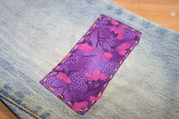 Para el segundo parche, solo me hizo un funcionamiento básico coser toda la manera alrededor de ella con hilo de bordar amarillo. No quiero que esto parece perfecto, y supongo que podría ir todos loco y bordar este lado, pero sinceramente, creo que se ve bien sin.