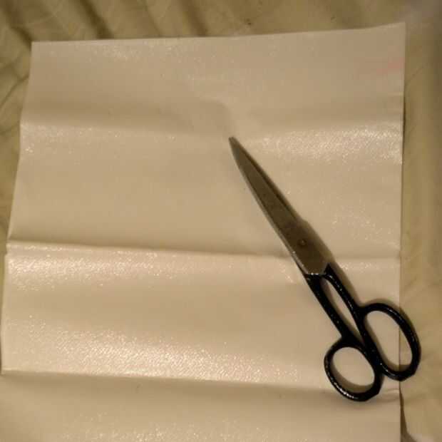 -Cortar a tamaño o forma necesitada. Pele apagado el forro de papel. (Cuadro #5 muestra el reverso de la tela una vez que el papel se pela apagado)