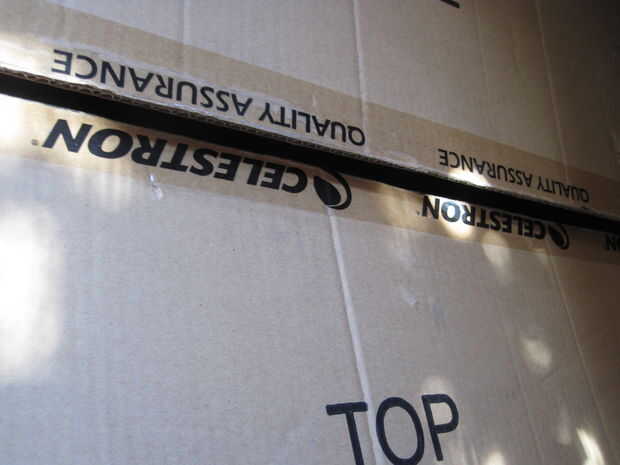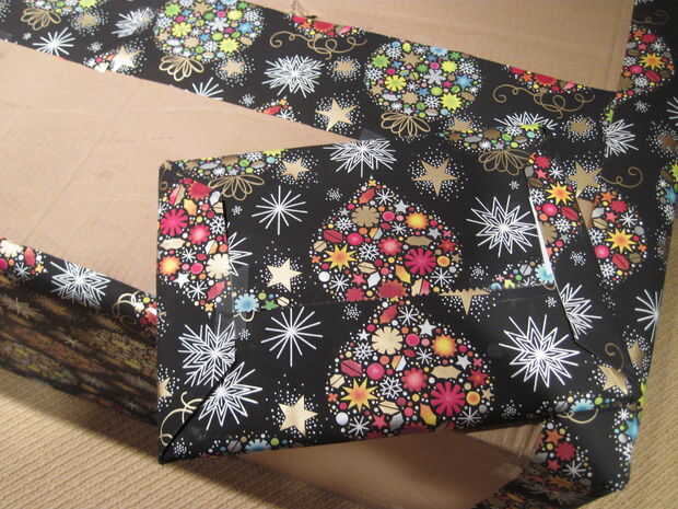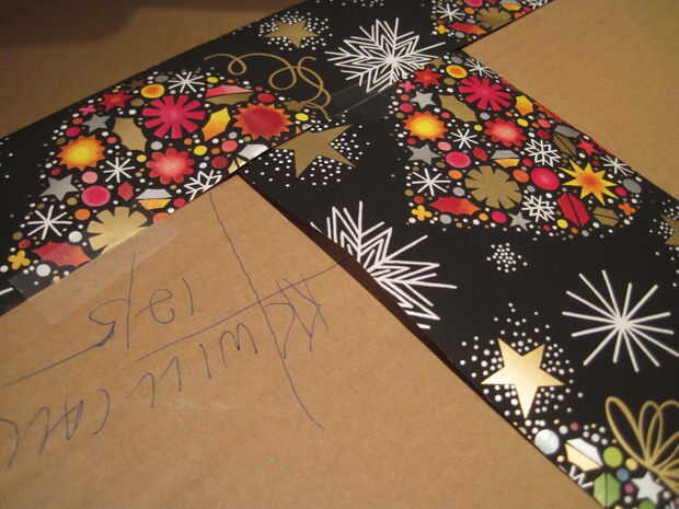 presente grande mi padre este año fue un telescopio computarizado. Vino en un gran caja marrón con logotipos en los laterales y logo impreso cinta sellado de la parte superior. Porque era demasiado grande para envolver completamente, sólo cubrí todos los logos y texto con papel de embalaje. Fue muy fácil; sólo cortar piezas y asegúrelas con cinta adhesiva en encubrir las señas. Para esta caja, resultó en un bonito patrón, especialmente con las estrellas relevantes en el papel de embalaje, y hace presente una sorpresa sin necesidad de mucho papel y esfuerzo.