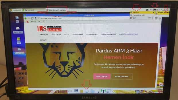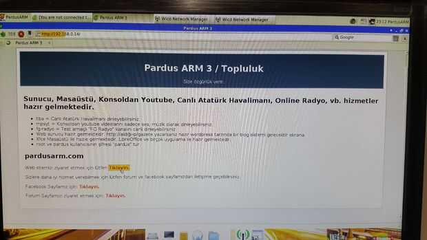 Ir a explorador de web predeterminado desde el panel de >> clic en el icono del mundo para ejecutar el navegador web >> tipo http://www.pardusarm.com Dirección >> presiona enter >> Si ves el logo de Pardus están conectados a la web!