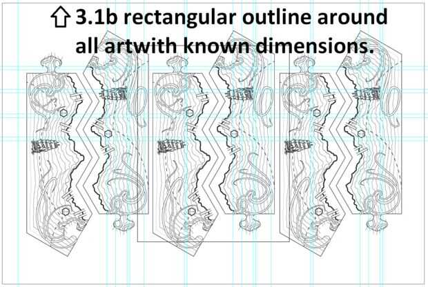 Para anidar juntos un montón de piezas: realizar un contorno rectangular alrededor de tu arte vectorial + los contornos del paso 2. Es importante centrar todo dentro de estas rectangulares y record que la longitud y altura "X y Y" dimensiones. (figuras 3.1a y 3.1b)