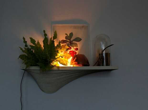 Este estante está invisiblemente conectado a la pared. Es para almacenar no sólo un par de libros pero también cosas que caerían normalmente de como sombreros y guantes, sino también revistas y plantas. Llenar el bolsillo con una lámpara y su habitación se enciende por arte de magia.