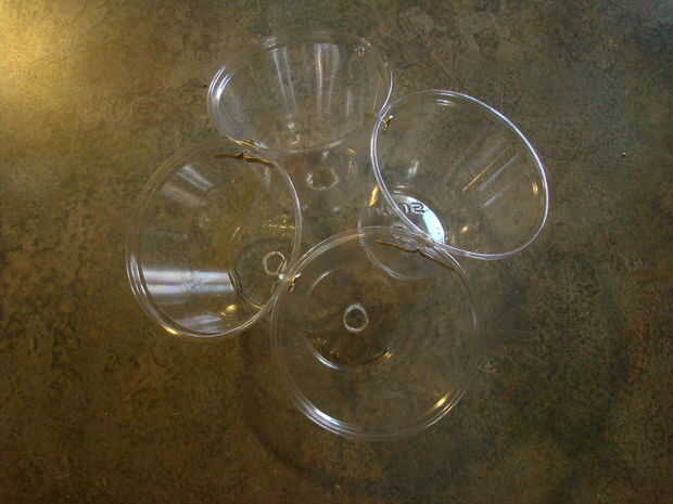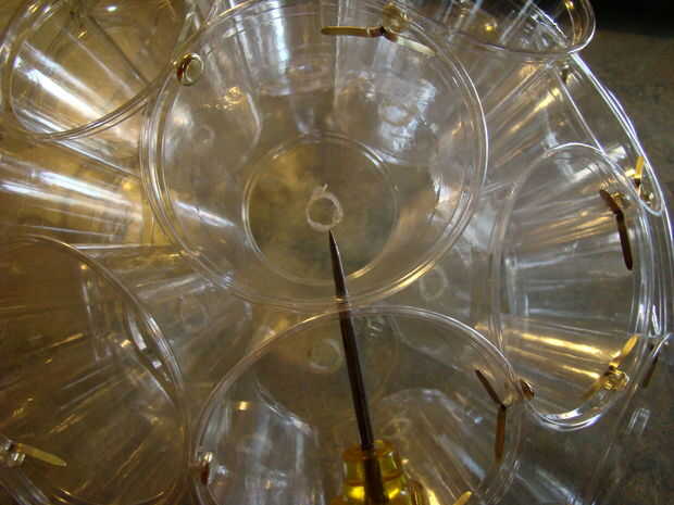 Ahora para la 3ª fila, sólo tienes 4 tazas a la izquierda, sujete para que formen un cuadrado. Luego, ponerlas en el espacio vacío en la parte superior de la esfera de la semi.  Donde las 3 tazas de fila toque tazas en la 2ª fila y use el punzón para empujar los agujeros y usar clavos para fijar la fila 3 a la 2 º fila.  Esta vez no tienes taza muy en la 2ª fila a una taza de la fila 3.