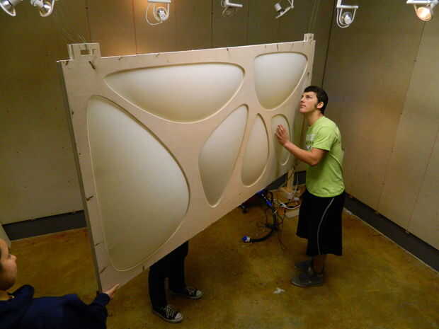 Usted puede usar lo que tengas a la bomba en el aire, pero el tamaño de su panel determinará la corriente que tendrá que hacer lo infle rápidamente. Para este tamaño, tendrá un aire serio. Para algo más pequeño, quizás podría utilizar una aspiradora de taller y revertir el flujo de aire. Mi escala abajo mock up utiliza un inflador del colchón de aire portátil, pero tomaría horas en esta escala.