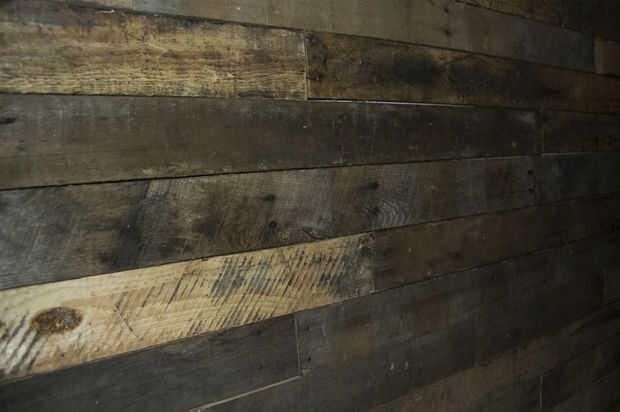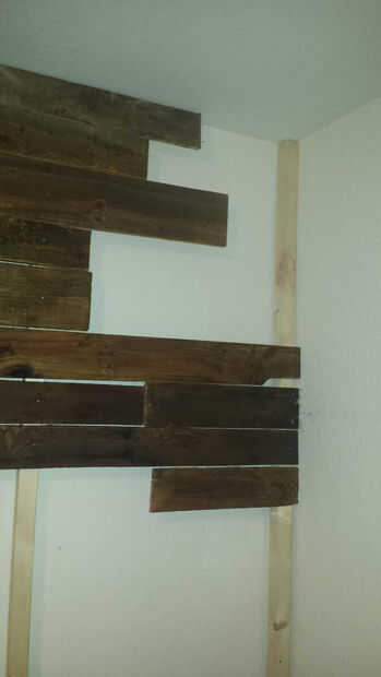 Paso cinco: Comenzando en el clavo de techo las piezas a los postes de madera del faux. A partir de la izquierda y el trabajo su camino hacia la derecha antes de pasar hacia abajo (similar a leer un libro). Cuando golpea al final más probable es que usted no tiene un ajuste perfecto, no dude en pasar una viene hacia la brecha. Me resulta más fácil hacerlo porque de esta manera usted puede cortar todas las piezas que vas a necesitar a la vez. Recuerde no cubierta y enchufes o interruptores de luz. EF son eléctricamente la mano le podía moverse construir una vivienda y un conjunto de que ellos integrada en su plataforma de la pared o si eres como yo solo dejan una abertura en la madera para que todavía se pueden acceder a ellas. Una vez la planta que puede Agregar ajuste si desea pero por ahora se verá el proyecto ya es resistente con hacia fuera. Agregar ajuste uso la izquierda sobre la plataforma y la línea apenas los bordes de la pared. Ahora regresa y llenar esos vacíos. Medir las brechas y corte una pieza para encajar.
