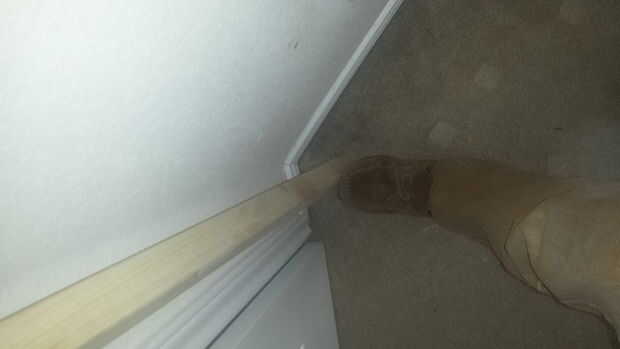 Paso cuatro: La cuña los postes en la almohadilla de goma en el techo. Asegúrese de que su como al ras en la parte superior de la pared como sea posible. Utilice el pie para empujar la parte inferior de la pared. No debe ser fácil de hacer si es que necesite un trozo largo de madera. Si usted necesita ayuda para conseguir el perno apretado, sienta libre de usar un martillo que golpee ligeramente la parte inferior de la pared. Otra vez no debe ser fácil de hacer. Si el martillo absolutamente no conseguirá el perno al ras utilice una cuchilla para afeitar un poco fuera de la almohadilla de goma hasta que bien puede exprimir al ras. Utilice un nivel para asegurarse de que el perno no está inclinado. Medir el appx. 18 a 20 pulgadas y sistema el siguiente poste. Repita hasta que todos los ESPARRAGOS sirven.