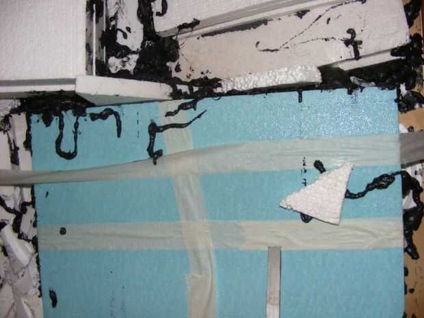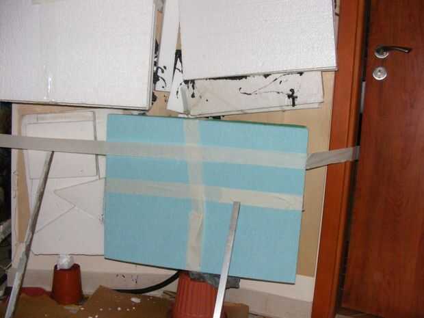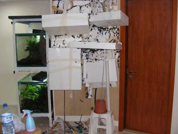 Temporal la espuma fijadas por clavos y cintas de enmascarar y luego se aplica la espuma en todos los rincones y huecos para rellenar, forma e instalar o arreglar las piezas grandes del tablero de la espuma... también macetas de plantas se montará y garantizar el desagüe para venir a través de la espuma para exterior...