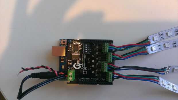 utilicé el Arduino UNO combinado con tres escudos LumiGeek para ejecutar la iluminación. LumiGeek ha dedicado escudos para 1 Watt RGB LED de la ayuda que requieren una corriente constante, tira de LED RGB direccionable y Non-Addressable RGB LED tira.
