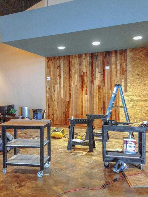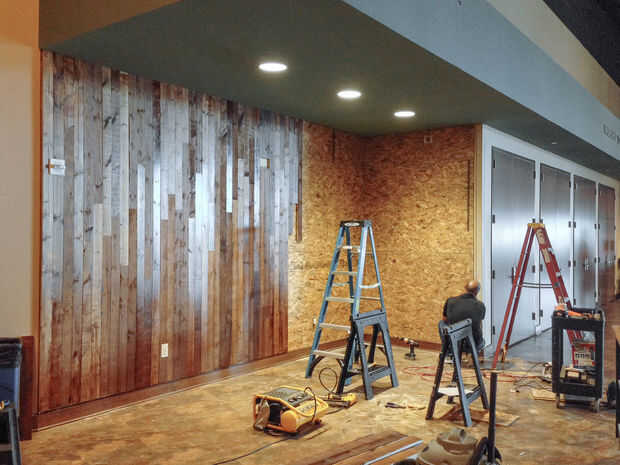 Subestructura. Puesto que se trata de un edificio comercial, necesitaba saber todo lo que iba a quedarse. También sabía que con mi tablas de ser verticales, nada tendría que clavarlas excepto tablaroca o golpear accidentalmente un perno prisionero del metal. Por lo tanto, la solución era cubrir las paredes en OSB de 7/16". Atornillar a los montantes metálicos cada 18" lugar todo apretado y hecho más fácil para nosotros clavar las tablas donde queríamos.