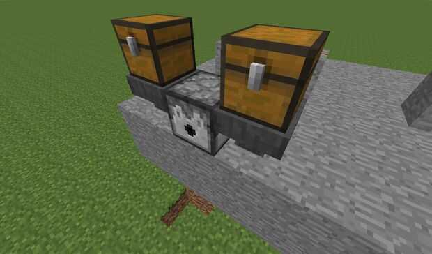 A continuación conecte dos tolvas en el lado del distribuidor (si no se utilizan al menos dos tolvas el índice del fuego del dispensador no será muy efectivo). Poner un cofre lleno de flechas encima de las tolvas. Te darás cuenta que cuando la máquina no está encendida, el dispensador no se llenará para arriba, esto es completamente normal.