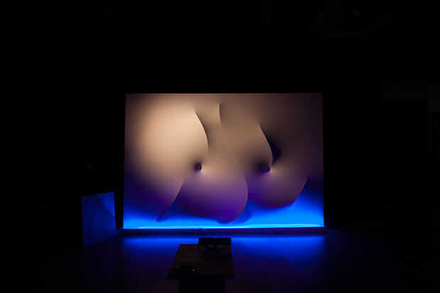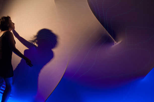 En "respiración pared 2.0" desde la superficie de las barras, información sobre la superficie era cambiante. La audiencia genera diversos movimientos físicos en la superficie de la pared por sus gestos con las manos mientras que la nueva información de datos superficiales es procesada y se proyecta sobre la superficie. Lo que es interesante aquí es el hecho de que la proyección y movimiento físico estén fijados en un circuito de retroalimentación. Sin embargo, usted podría estar interesado en persuadir a su público a tocar a la tela y se involucren con la superficie.