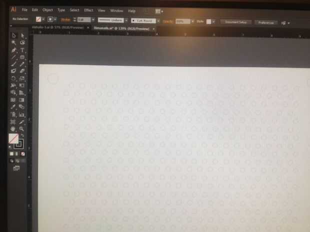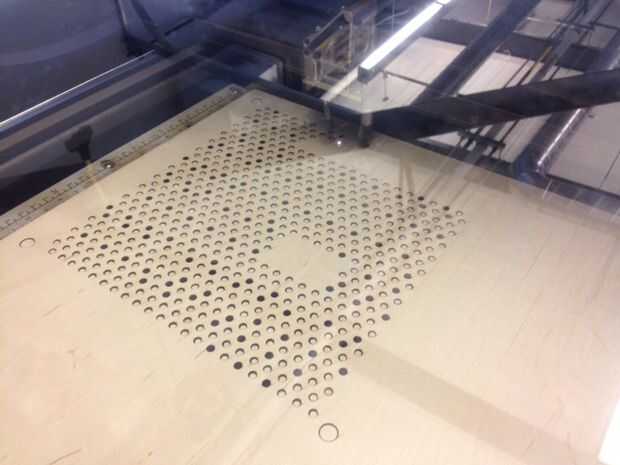 He creado la red de agujeros en Illustrator. Inicialmente trató de hacer los agujeros pequeños (pin tamaño) y con muchos más de ellos. Ya que apenas estoy aprendiendo todas estas cosas, no pude averiguar qué hacer cuando el equipo me dijo que el cortador del laser no podía cortar mi red. Es cuando me decidí a ir con menos y más grandes los agujeros y usar clavos. Cabe más mi estética de todos modos.