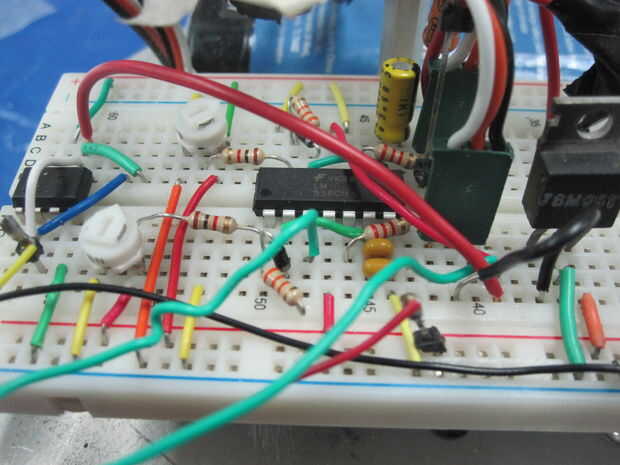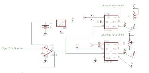 También, en el diagrama esquemático, no muestra cómo conectar el sensor de IR. Hay 3 cables en él. El cable rojo (corriente) va a los 5V después del regulador., el cable amarillo (señal) va a la entrada del búfer Op amp, y el cable negro (tierra) va a tierra.