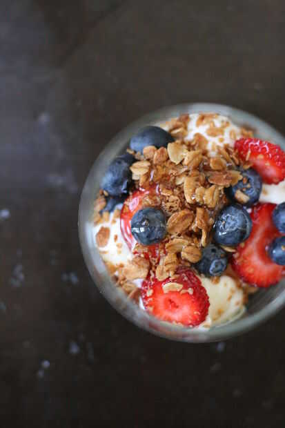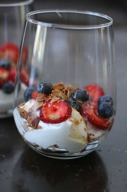 Agregue 1/2 taza de yogur en el fondo de cristal. Añadir 1/2 taza de bayas, 1/4 de taza de granola y un chorrito de miel por encima.