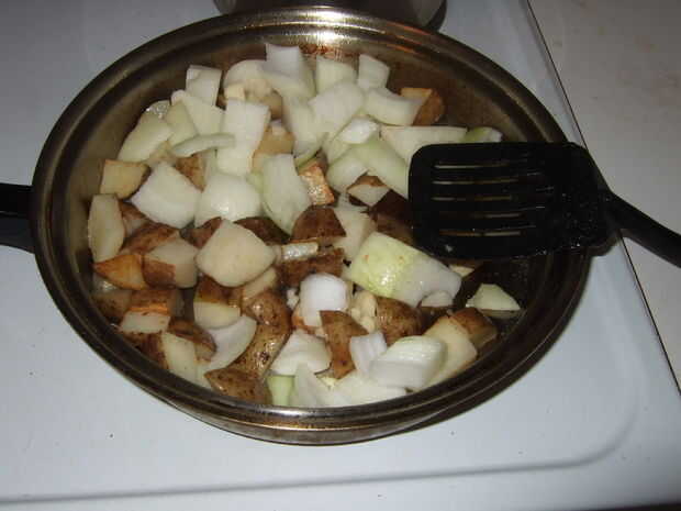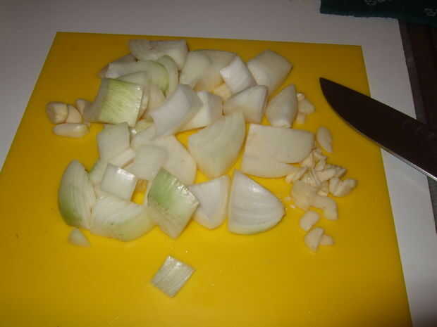 a continuación, cortar la cebolla y el ajo. Añadirlos a la sartén. Si lo desea, puede ahorrar unos trozos grandes de ajo para decorar.