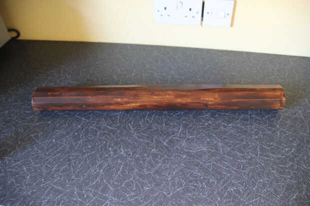 Utilicé un trozo de rollo de cocina y un pincel grande para liberalmente Aplique dos capas de la tinta para madera roble oscuro para el tubo de cartón. Otra vez, no estaba demasiado preocupado sobre e incluso difundir porque quiere parecerse a una rama de árbol. El tubo entonces se deja para secar.