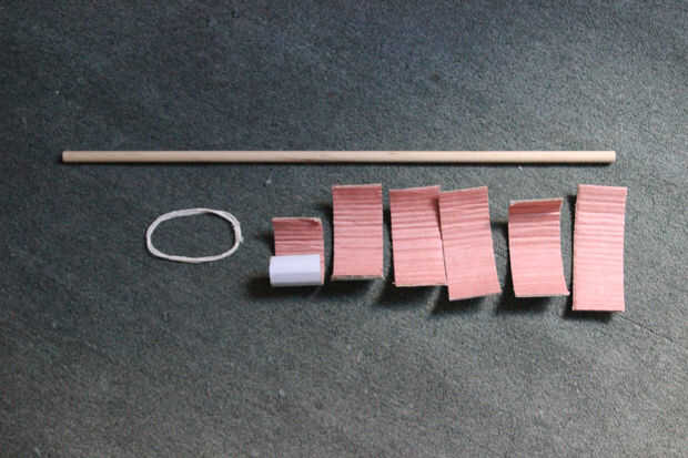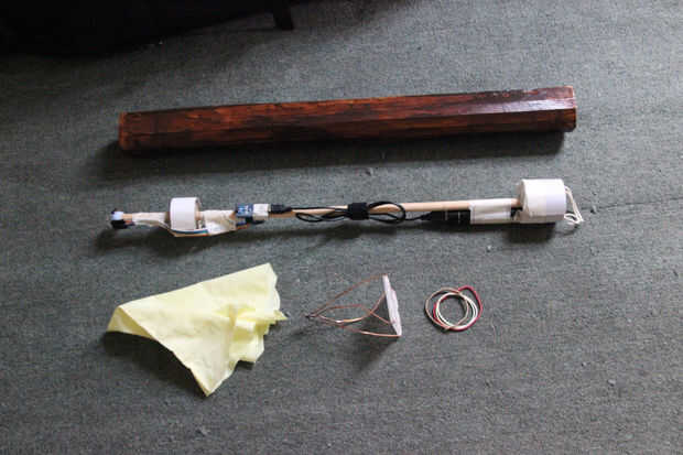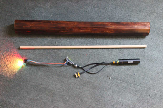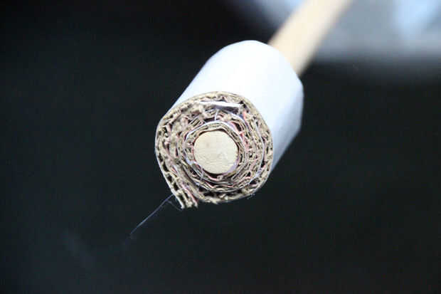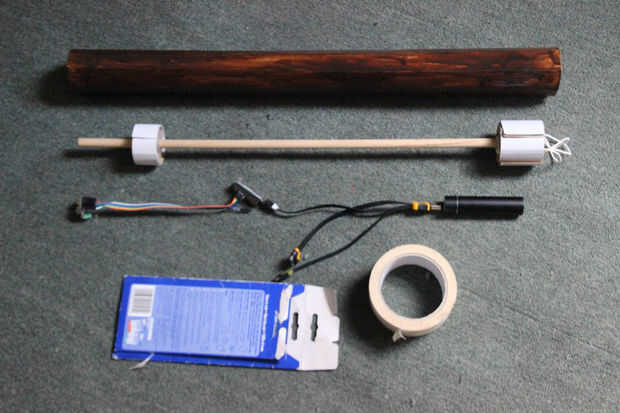 A continuación une la electrónica a la clavija de madera con alguna cinta de enmascarar y utiliza un pedazo de Blu-Tak para fijar los LEDs al final de la espiga. La longitud de la espiga era tal que los LEDs sería cerca de plástico esmerilado sin tocarlo. Todos los componentes se permitieron un poco de holgura pero no tanto que dejó caer por dentro del tubo.