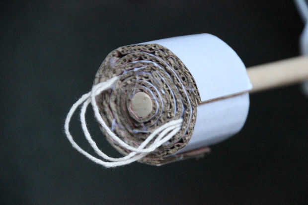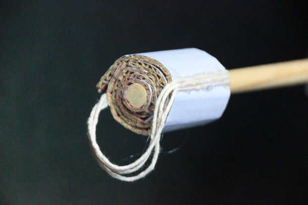 Usando la varilla de pasador y el cartón de desecho, envuelto de la cartulina (en tiras de ancho 50mm) alrededor de la espiga. Después de conseguir algunas de las capas de pegamento, os adjunto algunos bucles de cuerda para que yo pude extraer la electrónica cuando quería. Luego añadí bastante más capas de cartón para hacer de este pedacito de un firme ajuste dentro del tubo de cartón. (es decir, el diámetro exterior de esta parte es apenas menor que el diámetro interno del tubo anteriores). La cantidad de capas que necesitarás dependerá del tamaño del tubo y el grueso de sus cuñas de cartón. Seguir adelante hasta que quede apretado y caliente pegamento cada franja extra. Me puse otro separador utilizando tiras ancho 30mm cerca de la matriz de LED para limitar el movimiento de la electrónica.