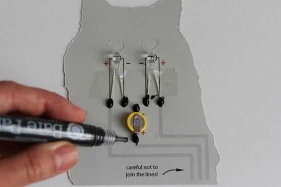 4. batería -baterías también están polarizadas. Las pilas que utilizamos tienen una pierna más larga (a partir de la parte superior) y una pata corta (debajo). Biselada hacia fuera las piernas para que la batería se quedar completamente plana sobre el papel y colocar el símbolo de circuito de la batería como se muestra, asegurándose la pierna más larga está en el lado el símbolo '+' y la pata corta es en el lado de los '-' símbolo. Poner una buena gota de pintura desnudos en ambas piernas para pegar a la tarjeta de