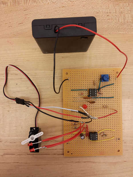 Se modifica el circuito del motor servo controlable de este proyecto con lo que las partes que tenía disponible. Sólo he podido conseguir sobre 120 º de giro opuesto a los 180 º completo con mi circuito, así que si usted puede conseguir sus manos en las piezas para ese proyecto yo recomendaría usando eso como una guía para su circuito de servo en su lugar.