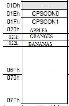 Este código hace que el compilador interpretar las palabras manzanas, naranjas y plátanos como números que se corresponden a las ubicaciones de memoria de bytes en el banco 0.