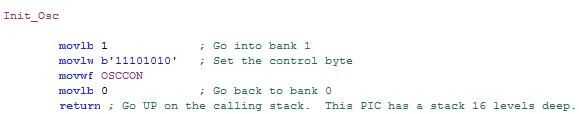 El valor que he usado para el valor que carga en el registro de control del oscilador (OSCCON) selecciona una velocidad de reloj de 4 Mhz del oscilador interno. Puesto que el PIC tiene un ciclo de instrucción de 4 reloj que significa que todas mis instrucciones llevará a Estados Unidos 1.