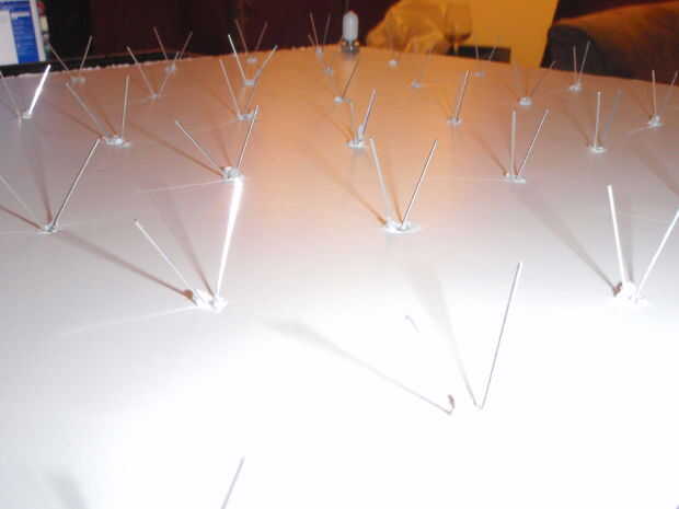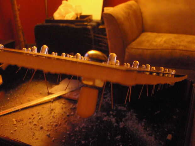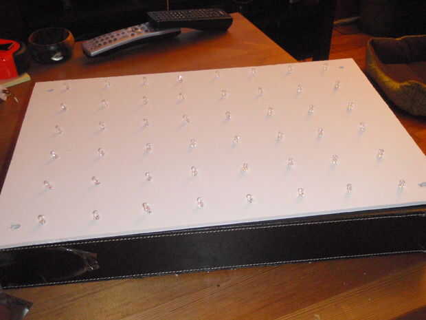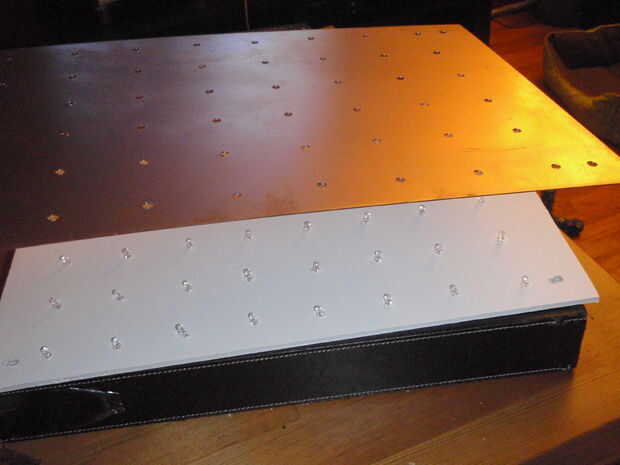 A continuación coge su chapa y situado en la cima de los LEDs y empezar a poner todos los LEDs a través de la parte inferior de la chapa. Si haces este derecho la cresta pequeña de los LEDs se pellizquen entre la cartulina y el metal de hoja.