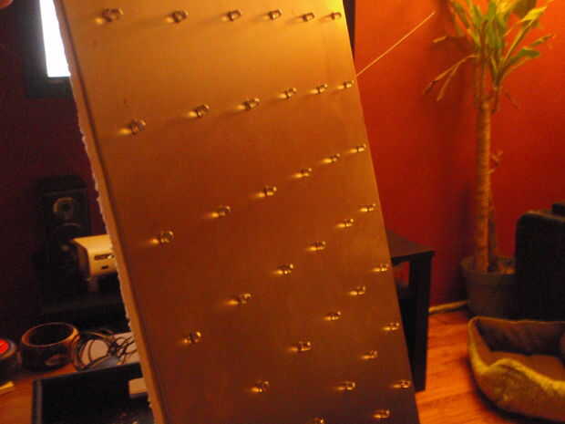 Una vez que todas las personas a través de y todos los LEDs en sus lugares, agarrar los tornillos y tuercas y deslice los a través de los agujeros que hiciste en las esquinas del tablero, esto mantener la cartulina a la chapa y mantener todos los LEDs en sus posiciones correctas.