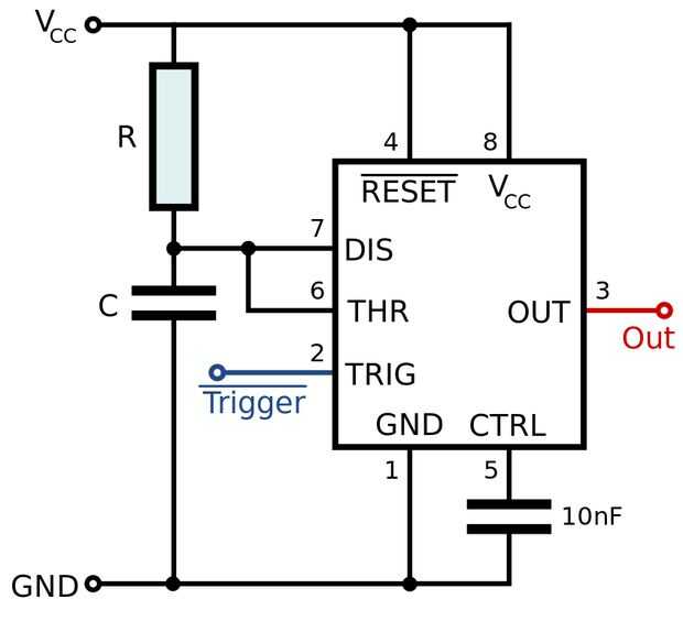 Este 555 está conectado como un monoestable multivibrador (que es un bocado!), también llamado un paso a paso. Esto significa que es la salida de un pulso cada vez que se activa por una señal externa que llega al pin 2. La duración del pulso es controlada por R y C en este diagrama.