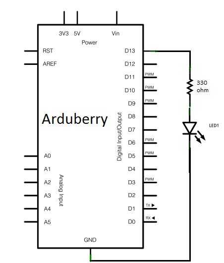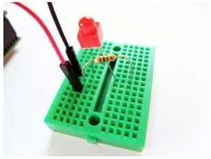 En este paso se conecte el LED usando un protoboard. Inserte una resistencia de 330 ohm en un protoboard y conectarlo al pin 13 de la Arduberry. Coloque la pata larga del LED (la pata positiva, llamada ánodo) a la resistencia. Coloque la pata corta (la pierna negativo, llamado cátodo) a tierra utilizando un cable puente.