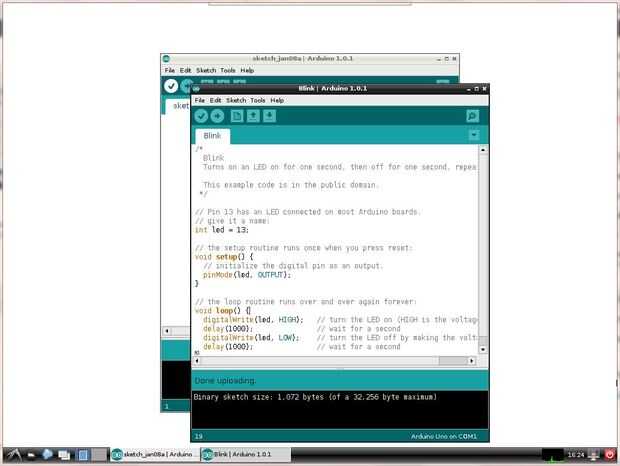Abra el ejemplo Blink en carpeta de ejemplos (ejemplos -> 01.Basics -> abrir y cerrar) y cambiar el programador a RaspberryPi GPIO (Herramientas -> Programador) y presione Ctrl + Alt + para cargar el programa (subir con programador).
