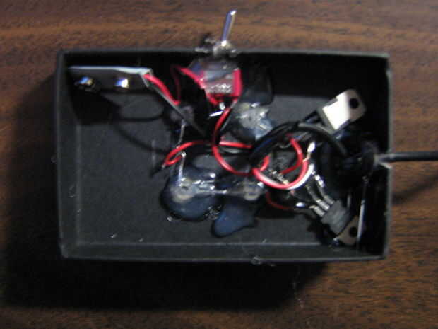 Conecte la parte positiva del clip de la batería a un lado de un interruptor y los extremos positivos de los LEDs a la otra. Luego montarlo todo en un caso (utilicé un viejo caso de joyería). Usé un gluegun caliente para asegurar todo y alguna cinta eléctrica para evitar cualquier cortocircuito.