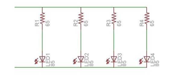 Mide cada LED para la resistencia y determina que cada uno era aproximadamente de 85 ohmios. Agregando que el valor del resitor nos pone unos 150 ohmios en cada uno de los 4 nodos paralelos. La resistencia paralelo total es de 37,5 ohms (Recuerde que la resistencia en paralelo es menor que la resistencia de cualquier nodo individual).